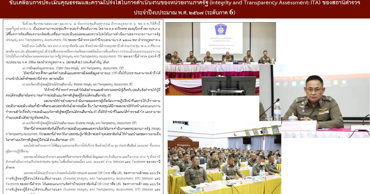 โดยมี ผบก.ในสังกัด, รอง ผบก.ภ.จว.ทุกจังหวัด และ หัวหน้าสถานีตำรวจทุกสถานี เข้าร่วมประชุม พ.ต.อ.ชัชวาล พวงคิด ผกก.สภ.เมืองเพชรบูรณ์ เข้าร่วมฟังบรรยายเรื่องการเตรียมความพร้อมในการขับเคลื่อนการประเมินคุณธรรมและความโปร่งใสในการดำเนินงานของหน่วยงานภาครัฐ (Integrity and Transparency Assessment: ITA) ของสถานีตำรวจ ประจำปีงบประมาณ พ.ศ. 256๗ ของตำรวจภูธรภาค ๖ ประกอบด้วย 3 ประเด็นสำคัญ ได้แก่