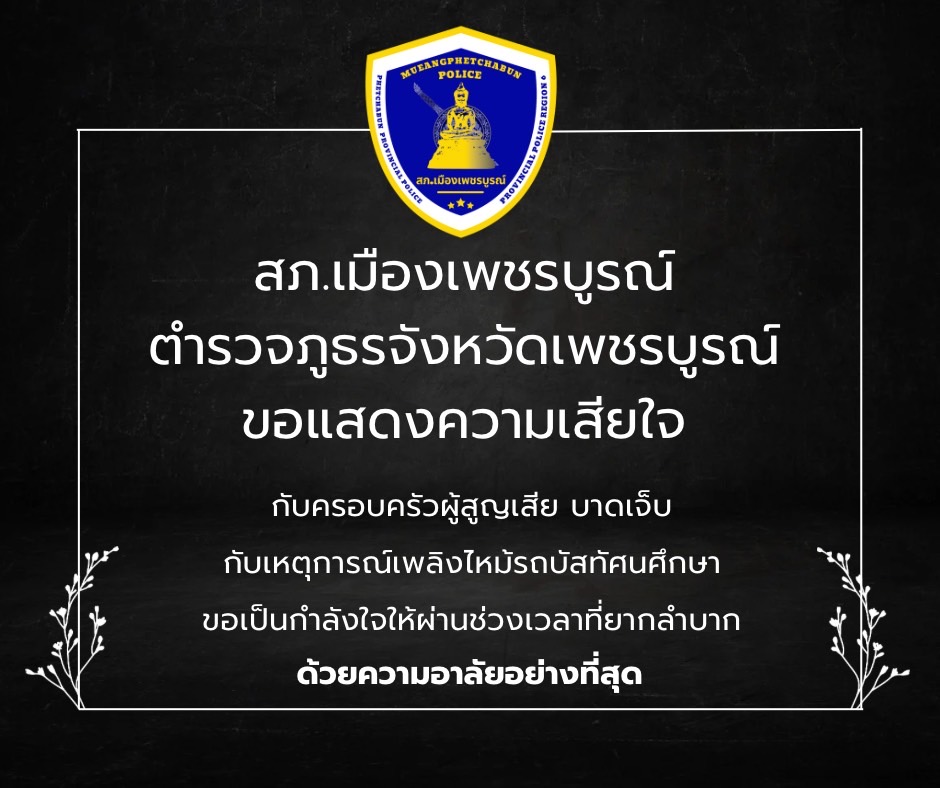 สภ.เมืองเพชรบูรณ์ อาลัยอย่างที่สุด 1 ตุลาคม 2567 โดย toomwirat / ไม่มีหมวดหมู่ Post Views: 29 สถานีตำรวจภูธรเมืองเพชรบูรณ์ ตำรวจภูธรเพชรบูรณ์ ขอแสดงความเสียใจ และเป็นกำลังใจ ให้กับครอบครัวผู้้เสียชีวิต จากเหจุการณ์เพลิงไหม้ รถบัสทัศนศึกษาของนักเรียน ด้วยความอาลัยอย่างที่สุด