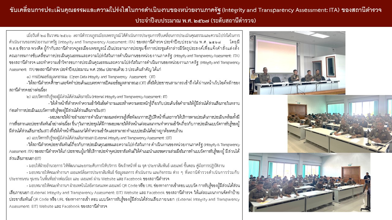 ขับเคลื่อนการประเมินคุณธรรมและความโปร่งใสในการดำเนินงานของหน่วยงานภาครัฐ (Integrity and Transparency Assessment: ITA) ของสถานีตำรวจประจำปีงบประมาณ พ.ศ. 2567 (ระดับสถานีตำรวจ)