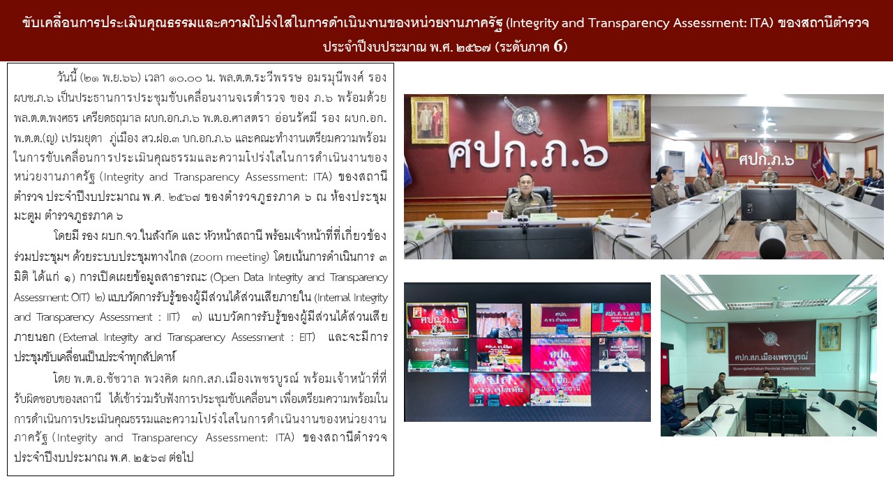 ขับเคลื่อนการประเมินคุณธรรมและความโปร่งใสในการดำเนินงานของหน่วยงานภาครัฐ (Integrity and Transparency Assessment: ITA) ของสถานีตำรวจประจำปีงบประมาณ พ.ศ. 2567 (ระดับภาค 6)