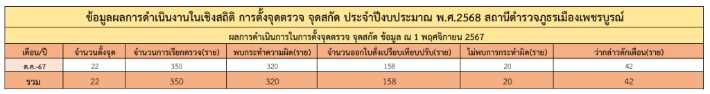 ข้อมูลผลการดำเนินงานในเชิงสถิติ การตั้งจุดตรวจ จุดสกัด เดือนพฤศจิกายน 2567
