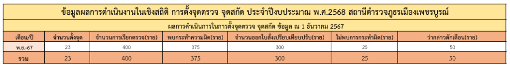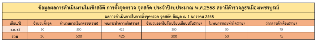 ข้อมูลผลการดำเนินงานในเชิงสถิติ การตั้งจุดตรวจ จุดสกัด เดือนธันวาคม 2567