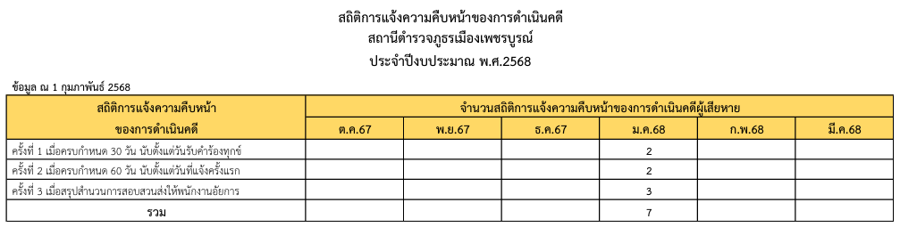 ข้อมูลผลการดำเนินงานในเชิงสถิติการแจ้งความคืบหน้าของการดำเนินคดี เดือน กุมภาพันธ์ 2568