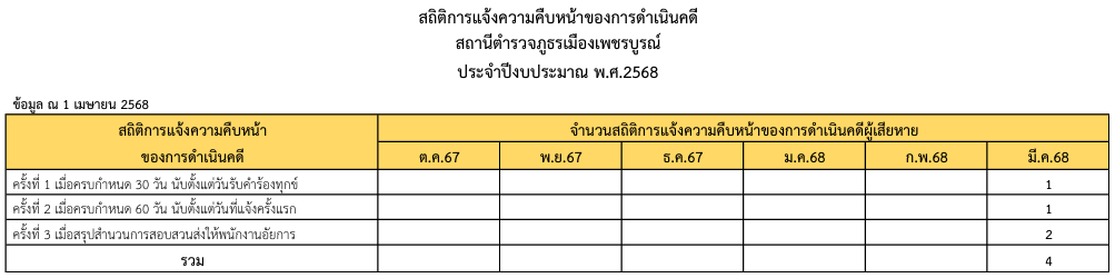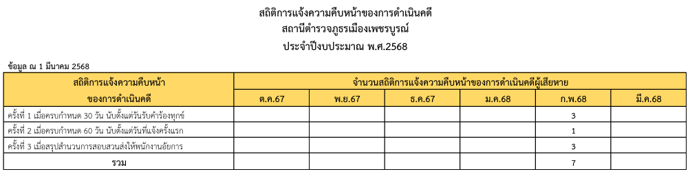 ข้อมูลผลการดำเนินงานในเชิงสถิติการแจ้งความคืบหน้าของการดำเนินคดี เดือน มีนาคม 2568