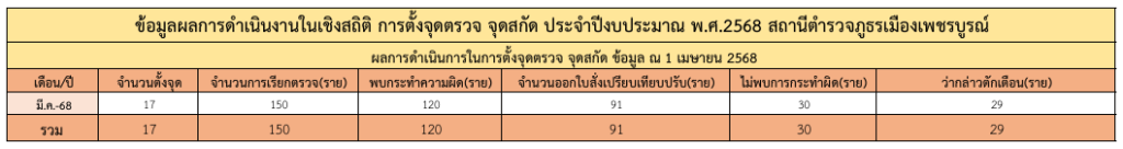ข้อมูลผลการดำเนินงานในเชิงสถิติ การตั้งจุดตรวจ จุดสกัด เดือนมีนาคม 2568